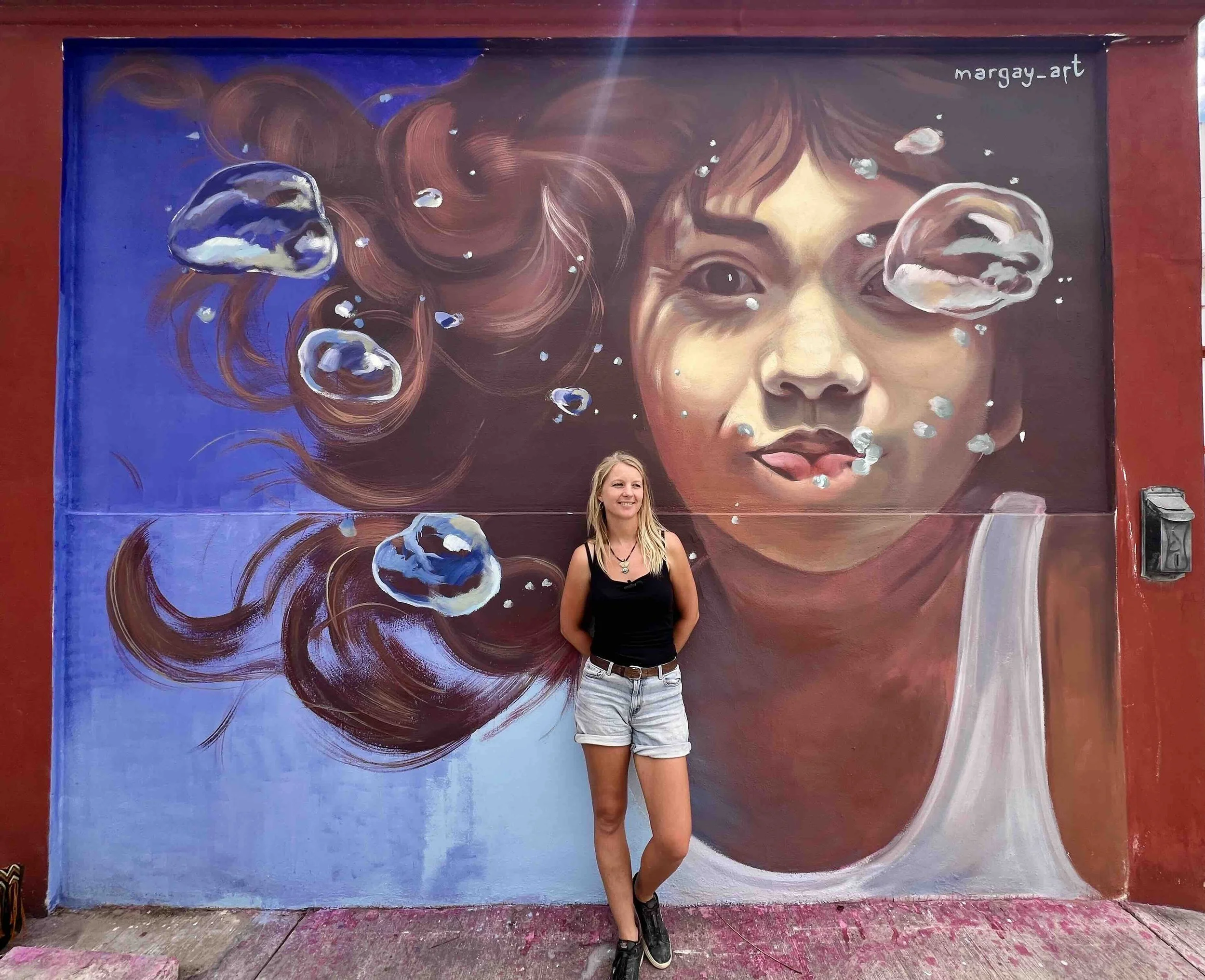 Ixchel is a mural by Margot inspired by the urgent issue of eutrophication in the cenotes of the Yucatán Peninsula. Named after the girl who modeled for the piece, the mural turns her face into a quiet but powerful symbol of fragility, water, and ecological awareness.