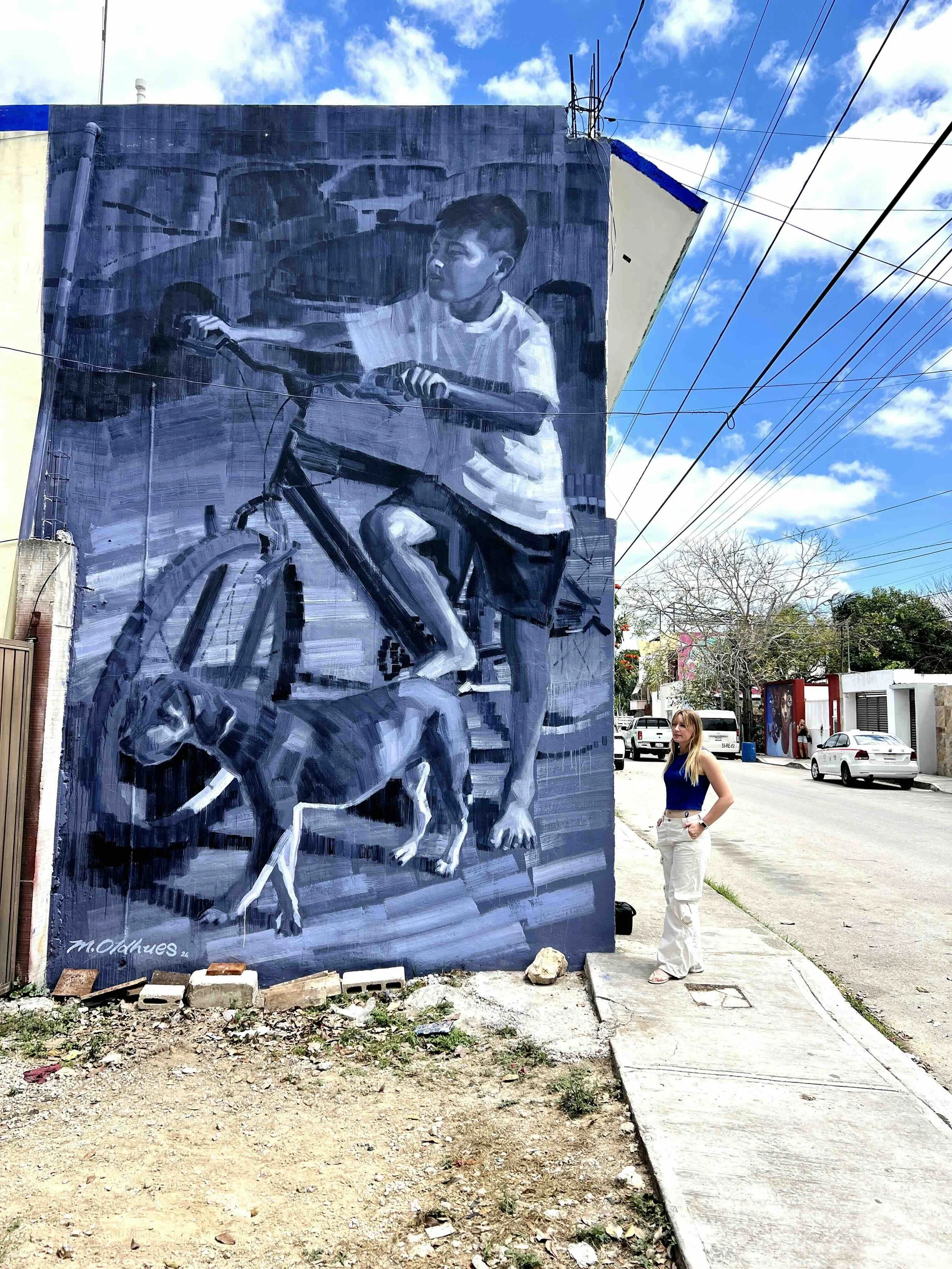 Megan Oldhues’ first mural in Tulum was created as part of the first phase of the Los Amigos de la Esquina Foundation project. Based on an everyday street scene, the piece turns a local moment into something intimate and monumental, centering childhood, movement, and the quiet bond between a boy, his bicycle, and his dog